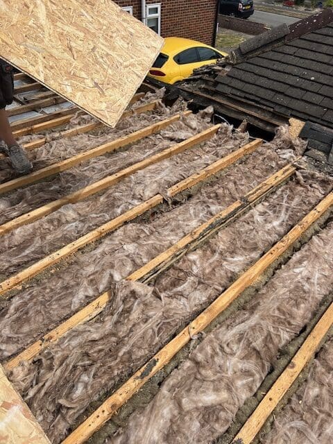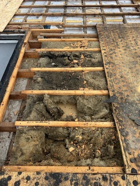 GPM stripped the failing flatroof up exposing the roof rafters. We installed new rockwall insulation before the installation of the new OSB boards.