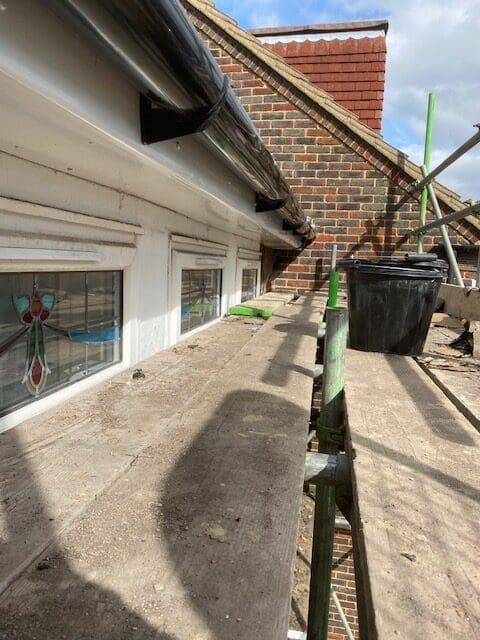 GPM stripped the entire roof back to rafters in preparation for the new felt and batten. We dented this project with breathable membrane felt and used 25×38 treated batten. We re used the existing tiles to tile this roof in as requested by the client, the main ridge was re bedded back on and a new UPVC fascia, soffit and black half round guttering was installed to finish this project